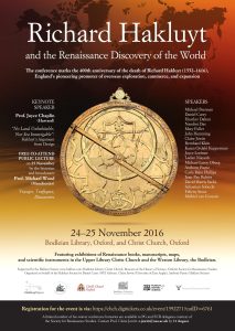 The two-day conference, Richard Hakluyt and the Renaissance Discovery of the World, takes place on 24 November at the Bodleian Library, and on 25 November at Christ Church, Oxford. Twenty renowned experts on Hakluyt and early modern travel and exploration have accepted an invitation to speak at the conference. The keynote lecture on 24 November, “No Land Unhabitable, Nor Sea Innavigable“: Hakluyt’s Argument from Design will be delivered by Professor Joyce Chaplin (Harvard University). At the conclusion of the event on 25 November, a free to attend public lecture, Voyages, Traffiques, Discoveries, will be given by the well-known broadcaster and historian Professor Michael Wood (more info below).