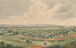 ‘Parramatta, New South Wales’, illustrates a growing urban centre surrounded by pastoral land. This place, 15 miles west of port town at Sydney Cove, was the home of the ‘Annual General Assembly of the Natives’, where Goggey is said to have sat at the head of his ‘tribe’.