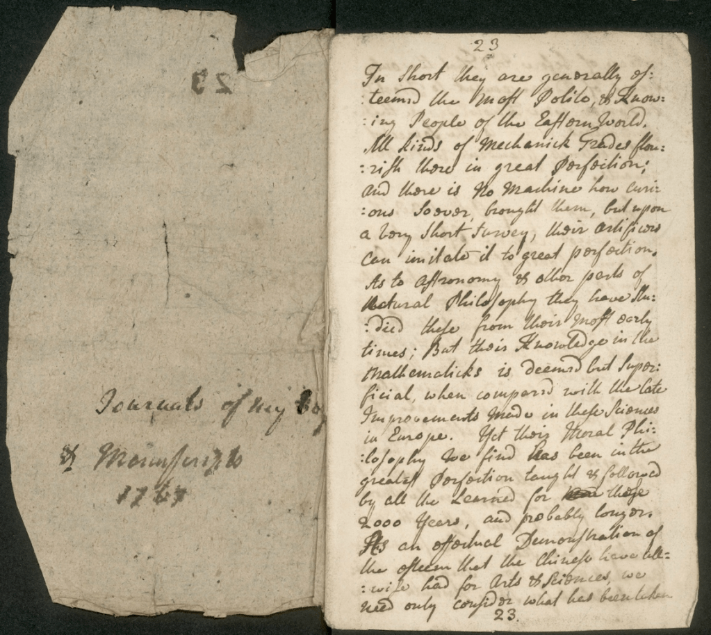 Despite the rather unexceptional voyages Fergusson’s diaries record, his account is nonetheless remarkable. Alongside descriptions of towns and peoples of the Indian Ocean trading-world during the 1730s, he relates local anecdotes and asides concerning the social lives of the inhabitants he encounters. In many ways Fergusson also offers a fresh perspective of how some Europeans saw themselves situated within their contemporary wider world. His observations are framed through the eyes of an individual who does not share in the civilizational hubris that became common amongst Europeans in the later eighteenth century. Sailing in an era before the Great Divergence, Fergusson was open to the ideas, practices, beliefs, and ways of governing that he witnessed on his travels. Interestingly for him, it was not Europe that set the standard for civilization, but rather China.